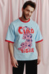 Light blue oversized T-shirt CIAO TIGER with contrasting red ribbed details. The front features a unique graphic of a tiger with heart-shaped spots, one of which contains the subtle inscription "She is Sunday." The custom typography adds a distinctive touch, enhancing the T-shirt’s original design. A perfect choice for those who appreciate comfort and style with an artistic twist.