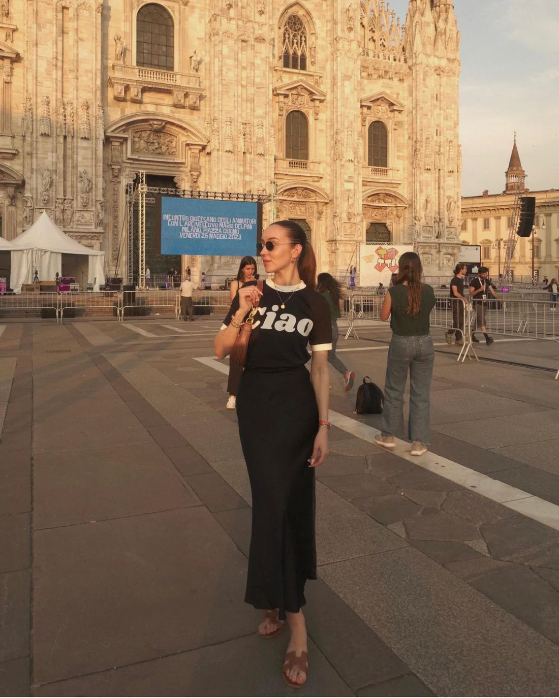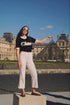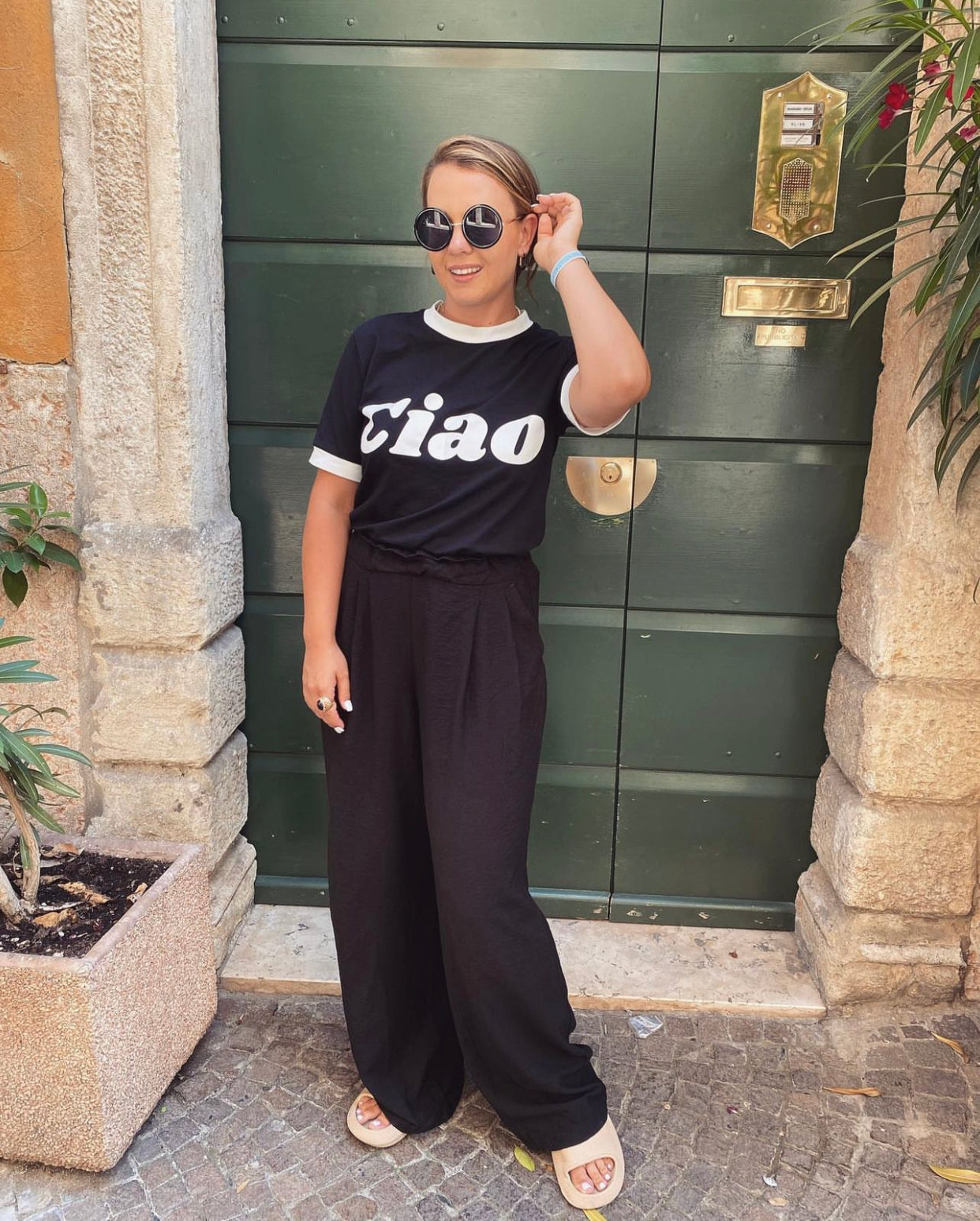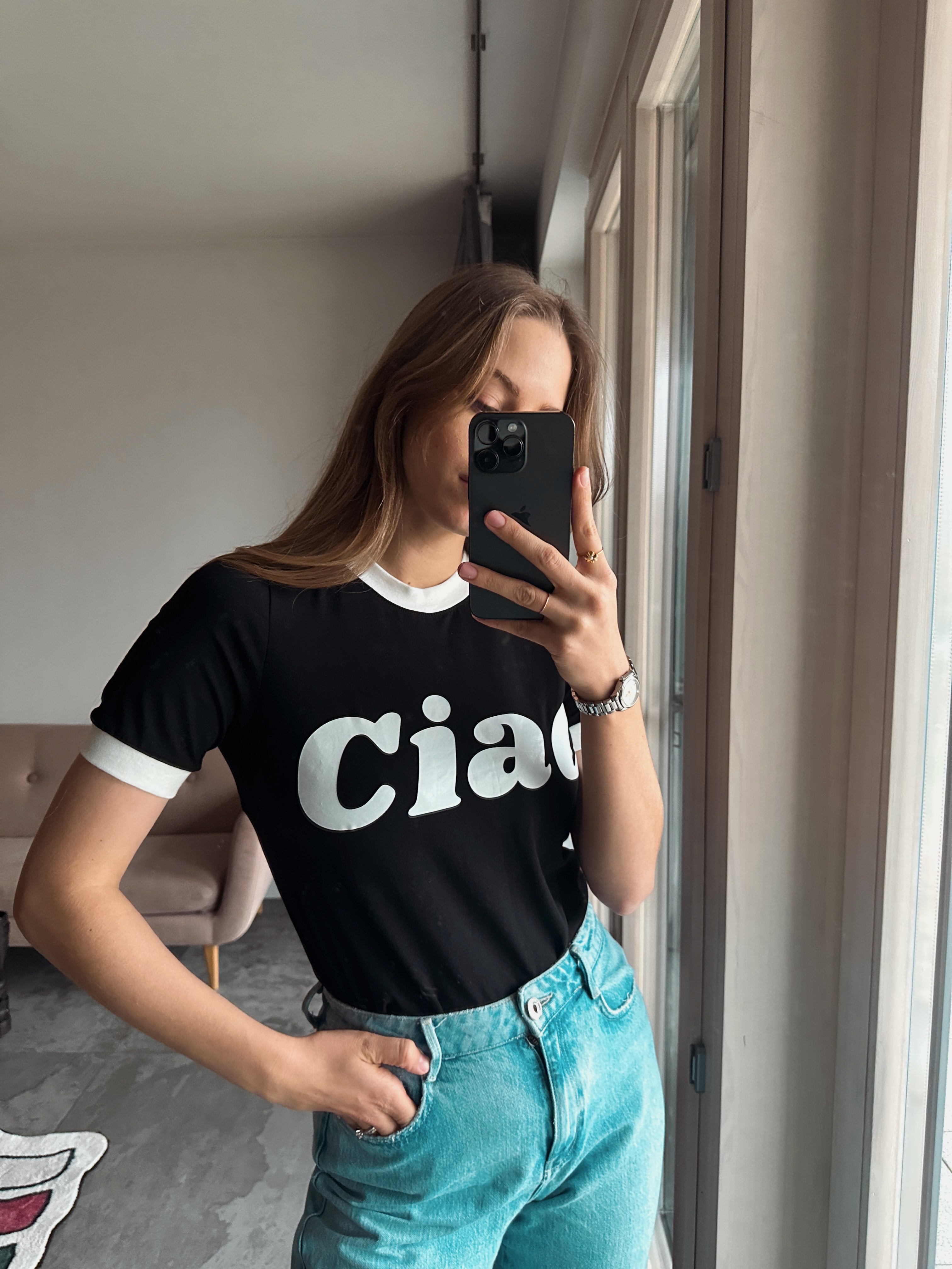 Our best-seller CIAO t-shirt in a contrasting combination of black and milky-white cuffs and print. CIAO is a symbol of joy, community and the Italian lifestyle with which we identify as a brand.