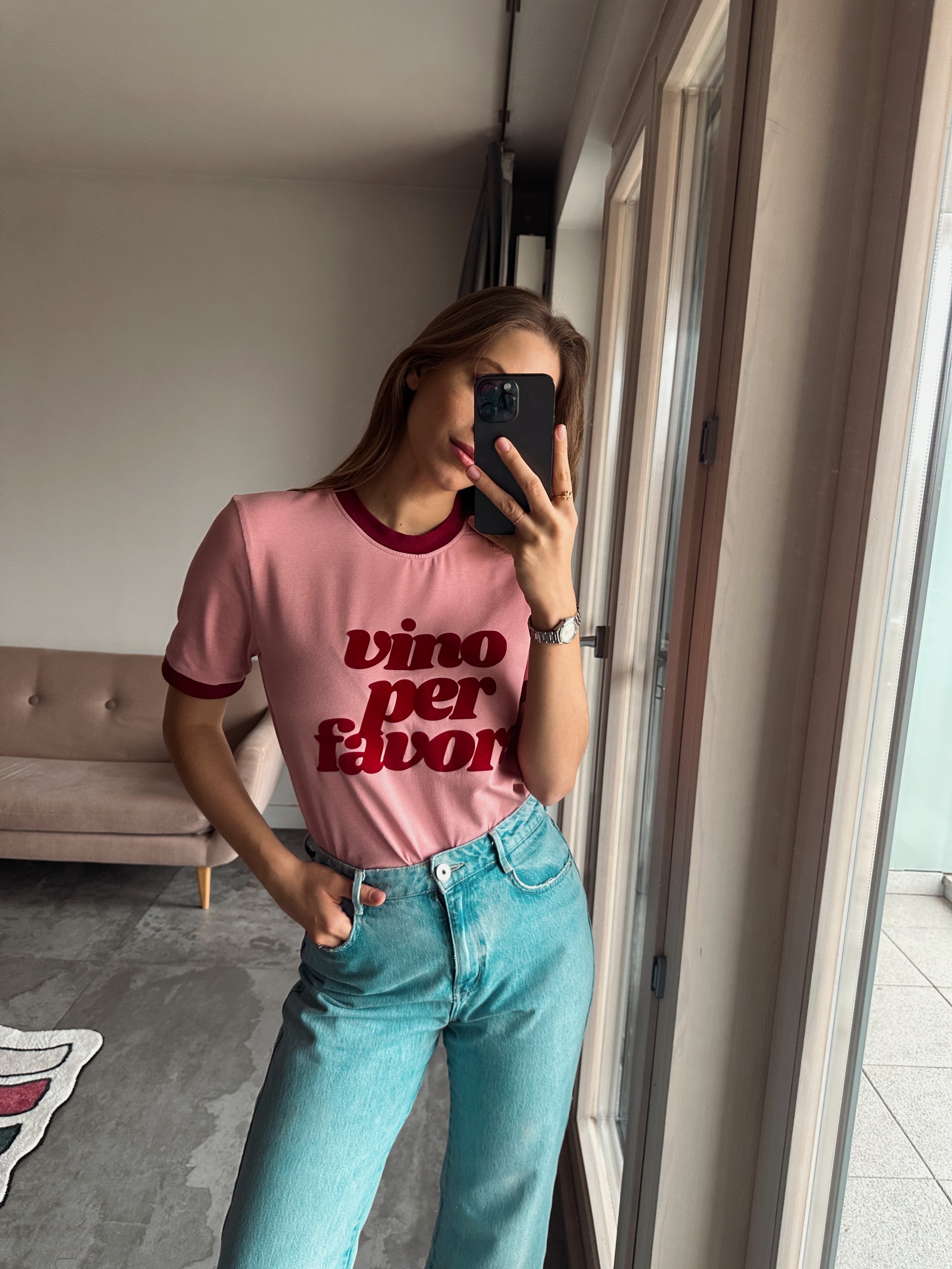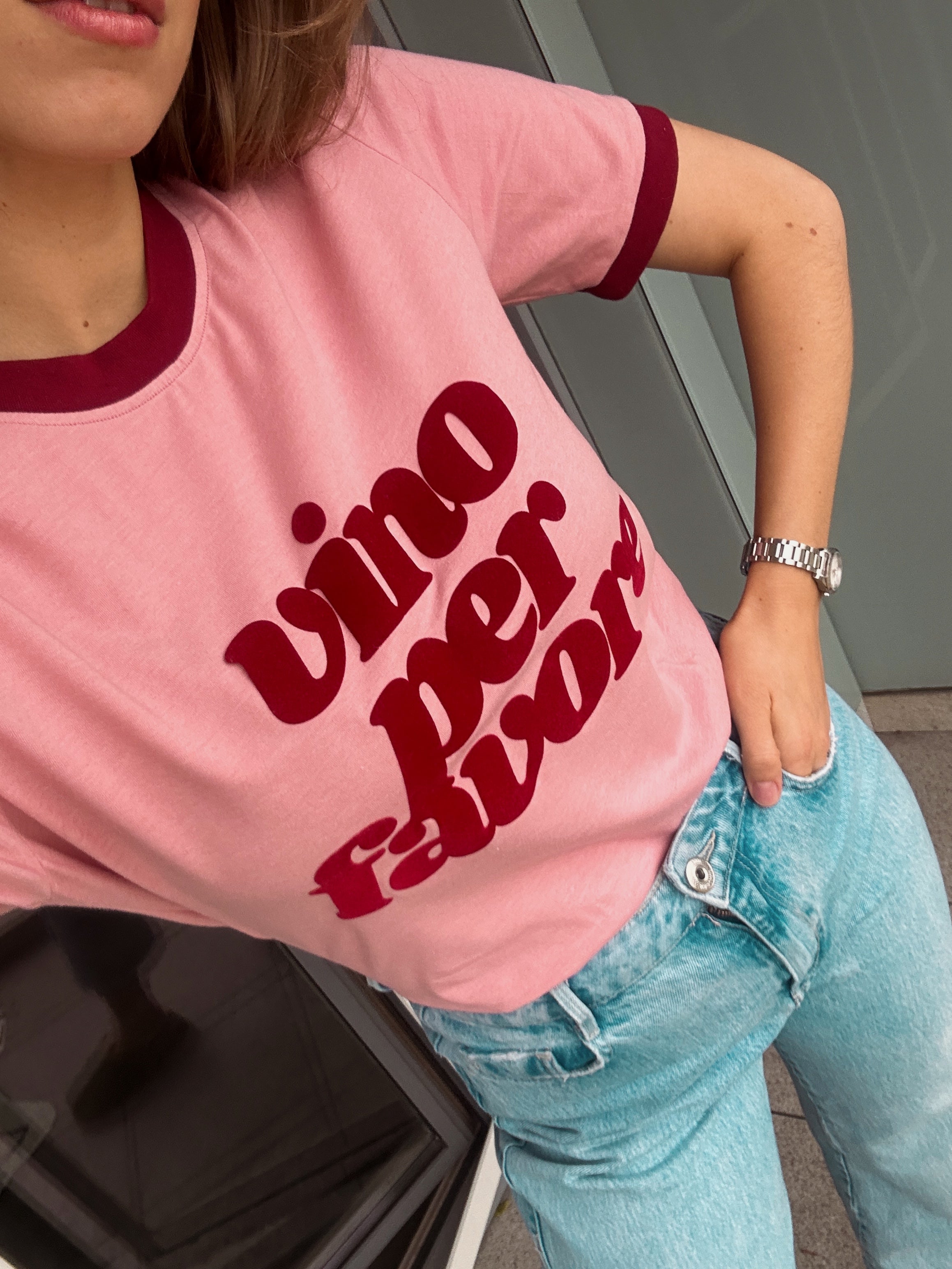 The "Vino Per Favore" T-shirt is not only perfect for a night out with the girls but also for everyday wear. Its beautiful combination of pink and burgundy will add a unique style to any outfit. Put on the Vino Per Favore T-shirt and feel like you're on the Amalfi Coast, sipping a glass of delicious red wine at sunset!