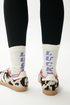 Skarpetki Lucky to Twój osobisty talizman w kolekcji Rodeo Girl. Wykonane z miękkiej bawełny z dodatkiem elastycznych włókien, idealnie dopasowują się do stopy i zapewniają komfort przez cały dzień. Biały, klasyczny kolor został przełamany wyrazistym, fioletowym napisem „LUCKY” umieszczonym z tyłu. To ten rodzaj dodatku, który puszcza oko do klasycznej mody i dodaje luzu każdej stylizacji!